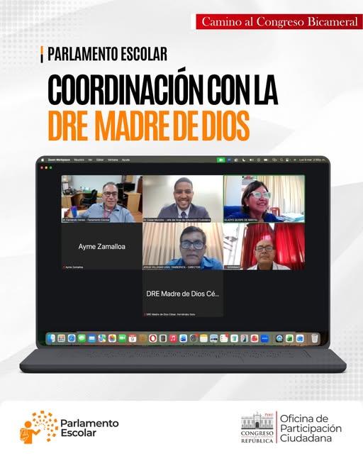 En el marco de este esfuerzo institucional, también se realizó una reunión virtual de coordinación con la Dirección Regional de Educación de Madre de Dios para impulsar el desarrollo de talleres presenciales y la organización del Plenario Regional del Programa Parlamento Escolar 2026.
