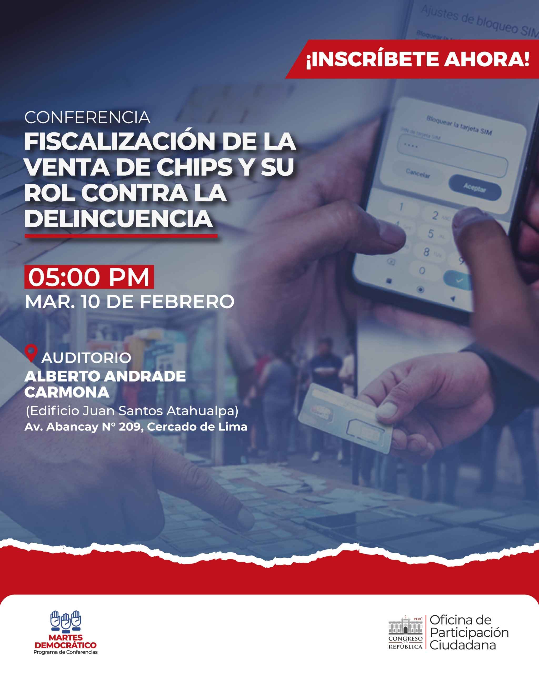 El programa Martes Democrático organiza la conferencia “Fiscalización de la venta de chips y su rol contra la delincuencia”, un espacio de análisis y reflexión ciudadana sobre los mecanismos de control y supervisión vinculados a la seguridad ciudadana y la lucha contra la criminalidad.