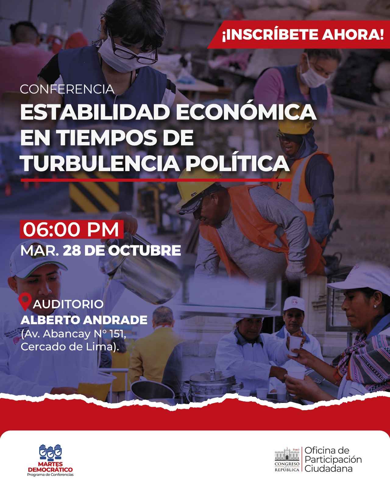 El programa Martes Democrático invita a la ciudadanía a participar en la conferencia “Estabilidad económica en tiempos de turbulencia política”, que se realizará el 28 de octubre a las 6:00 p. m. en el Auditorio Alberto Andrade Carmona del edificio Juan Santos Atahualpa (Av. Abancay N° 151, Cercado de Lima).