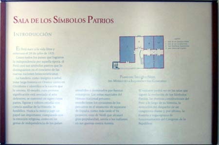 El Perú nace a la vida libre y soberana el 28 de julio de 1821. Como todos los países que lograron la independencia por aquella época, el Perú creó sus Símbolos Patrios que lo distinguieron en el concierto de las nuevas naciones latinoamericanas. La Bandera, como insignia o señal, tiene larga historia en Oriente como en Occidente e identifica a la nación que la ostenta. El Escudo cuyas partes, figuras y colores estudia una ciencia auxiliar de la Historia: la Heráldica. Nunca la música jugo un papel tan importante, comparado con la emoción religiosa, como en las gestas de la independencia de los países invadidos o dominados por fuerzas extranjeras. Las notas marciales del Himno Nacional enardecieron los corazones de los peruanos en el momento de separarse de España, como más tarde el Vapensiero, coro de Verdi que alcanzó gran popularidad, uniría a los italianos en las guerras contra Australia. El visitante podrá ver en las salas que siguen la evolución de los Símbolos Patrios y las diversas Constituciones del Perú a lo largo de la historia, las salas dedicadas a algunos ilustres Congresistas y, por último, la historia y organigrama de funcionamiento del Congreso de la República.