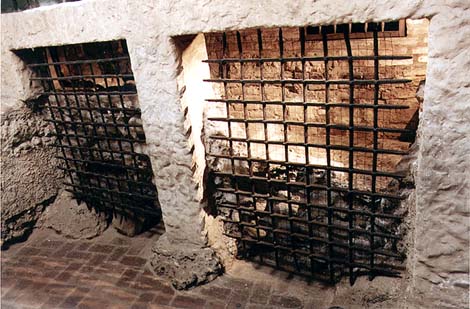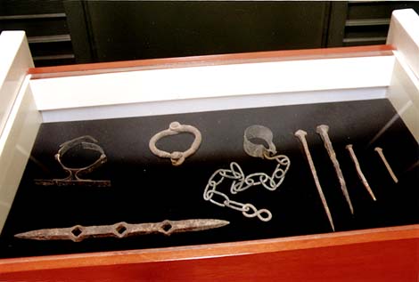 Grilletes. En la vitrina observamos grilletes usados por la Inquisición, barrotes originales de las celdas del Tribunal y clavos de la construcción del inmueble.