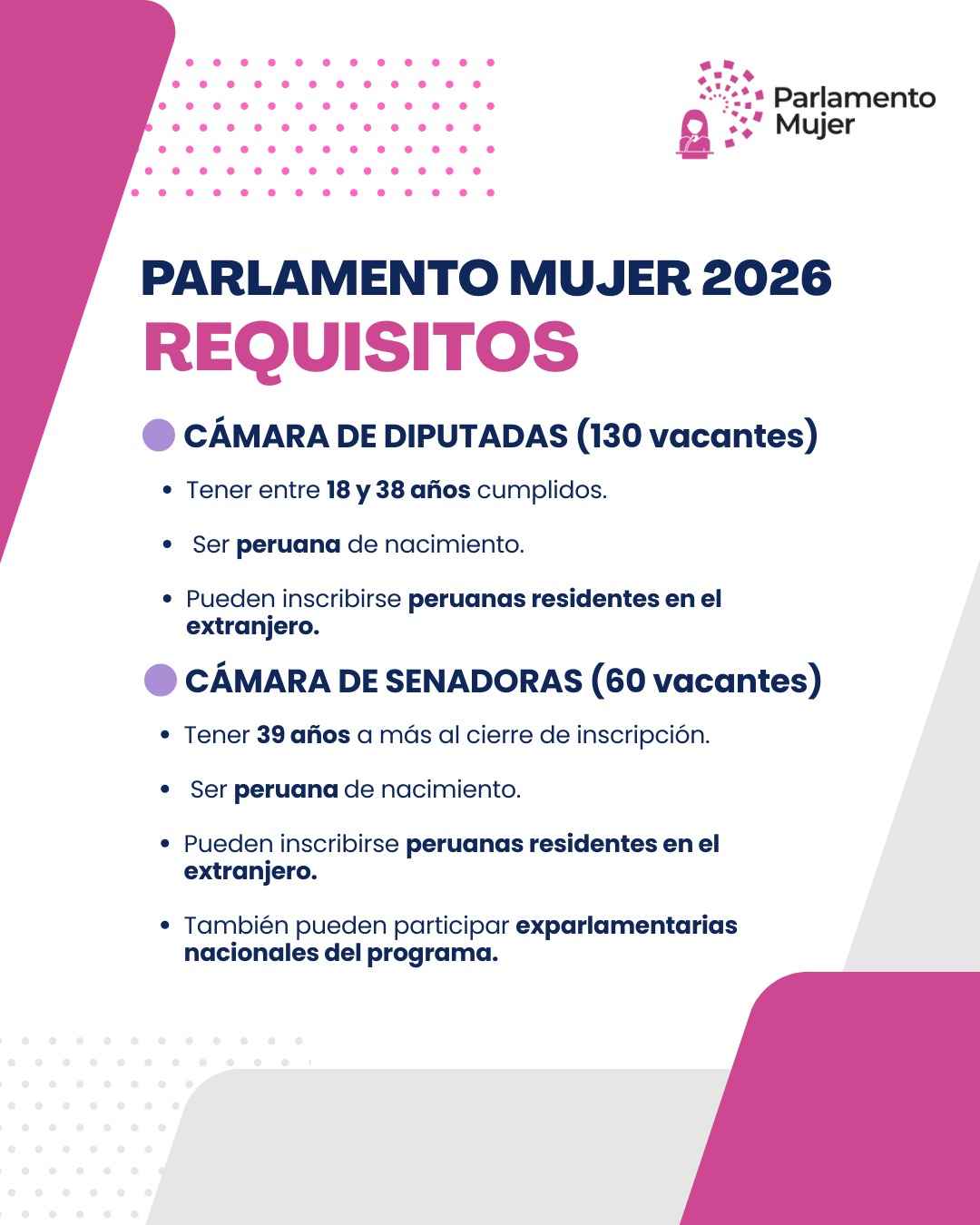 La convocatoria comprende la Cámara de Diputadas y la Cámara de Senadoras, brindando a las participantes la oportunidad de vivir una experiencia de formación parlamentaria práctica, conocer el funcionamiento del Congreso de la República y ejercer el debate, la propuesta y la representación desde dentro.