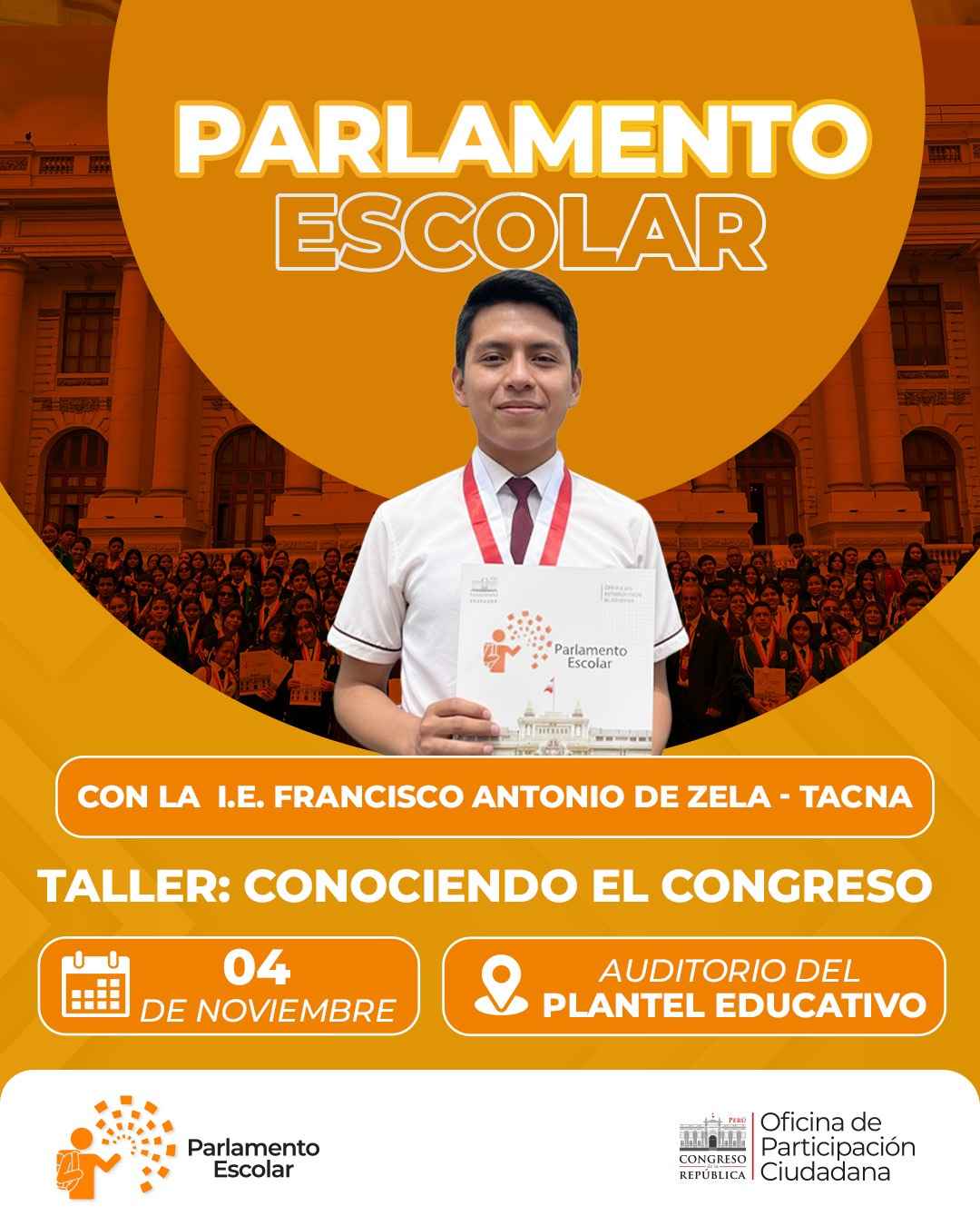 Como parte de la jornada de formación parlamentaria, el martes 4 de noviembre se dictarán cuatro talleres con la participación de los estudiantes de segundo, tercero, cuarto y quinto año de secundaria de la I.E. Francisco Antonio de Zela, con la participación de 288 estudiantes de secundaria