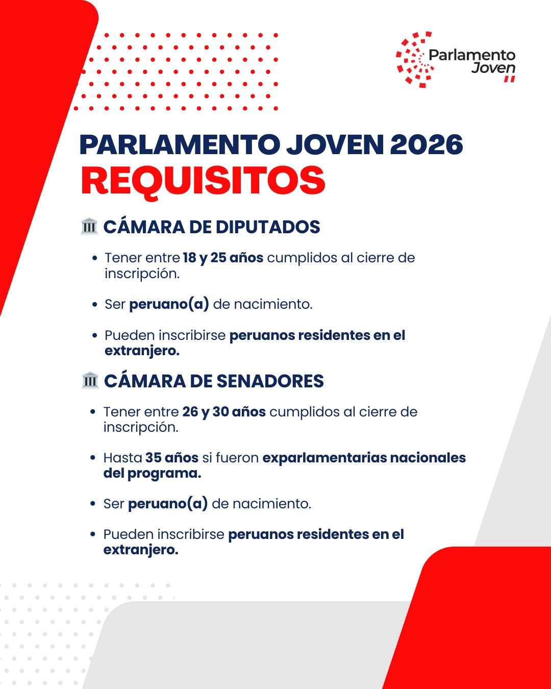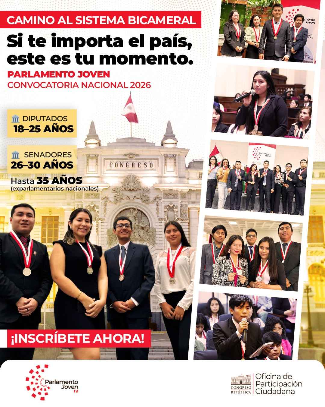 La Oficina de Participación Ciudadana abrió la convocatoria nacional 2026 del programa Parlamento Joven, dirigida a jóvenes de todas las regiones del país y del exterior interesados en participar activamente en la vida democrática y conocer de manera directa el funcionamiento del Congreso de la República, en el marco del proceso de implementación del sistema bicameral.