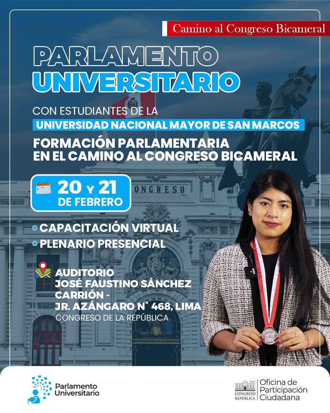 En el marco del proceso de formación parlamentaria en el camino hacia el Congreso Bicameral, se realizará el Parlamento Universitario con estudiantes de la Universidad Nacional Mayor de San Marcos, los días 20 y 21 de febrero de 2025.