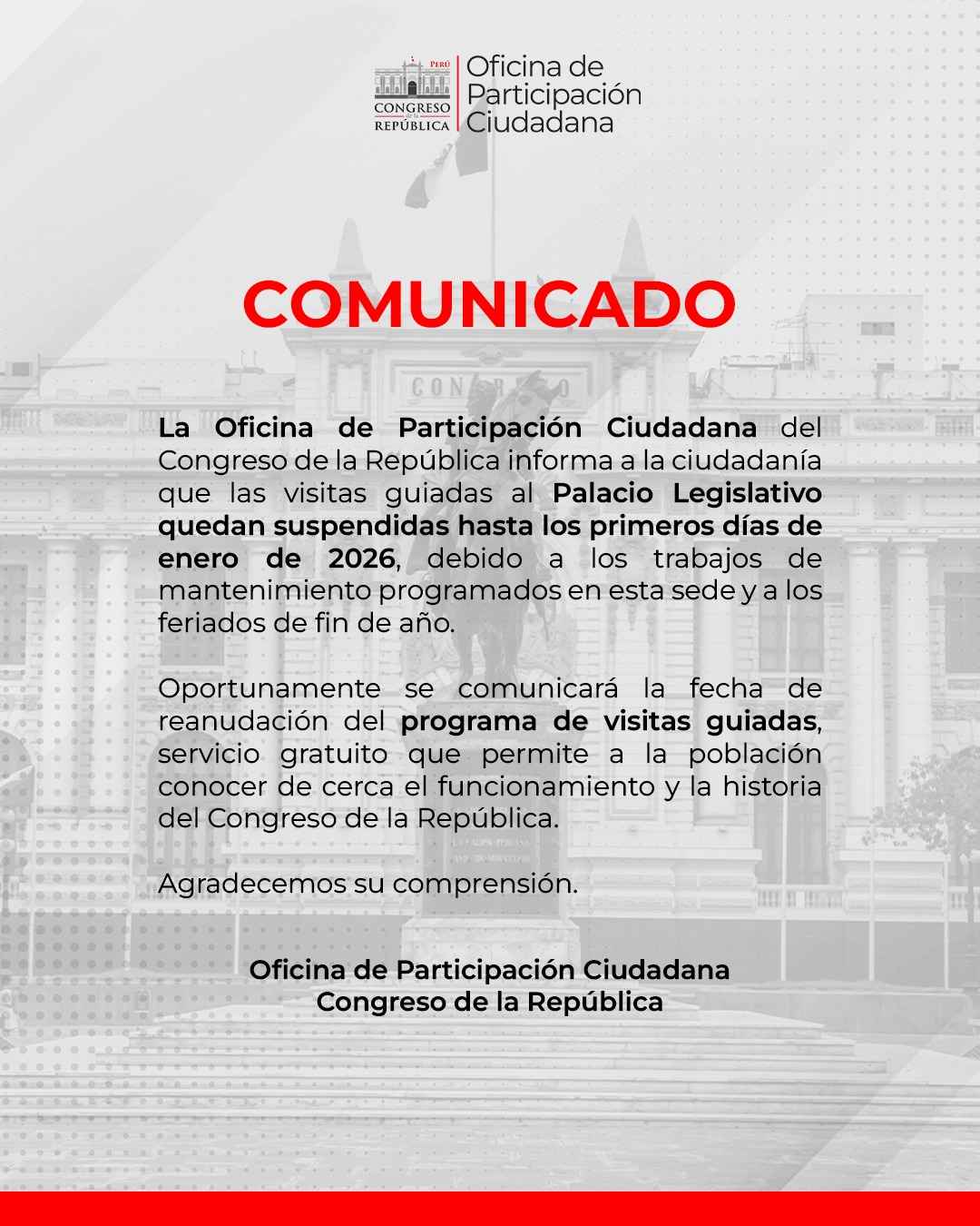 Para consultas o futuras reprogramaciones, puede comunicarse con el programa de Visitas Guiadas al correo: visitas@congreso.gob.pe o a los